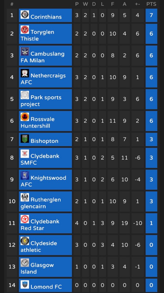 Park Sports Project: Narrow 2–3 loss to Corinthians in their last outing, but strong earlier wins against Clydeside Athletic and Clydebank SMFC.