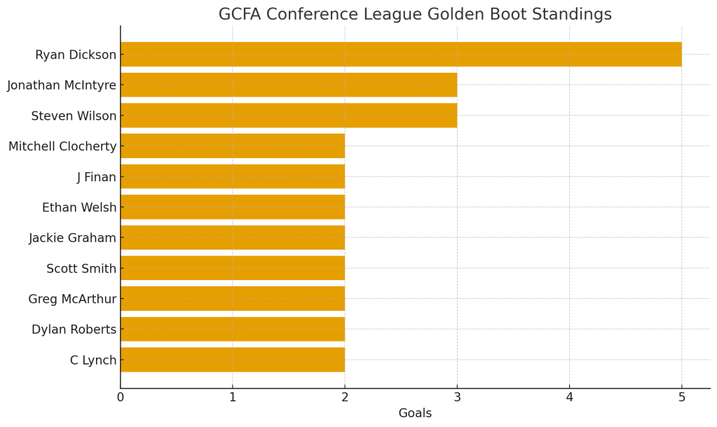 The race for the Conference League Golden Boot is heating up, with goals flying in across the division and several players staking their claim for the top scorer’s crown. From Cathcart’s sharp shooters to FC Remo’s attacking firepower, the standings are already shaping into a thrilling contest. With Ryan Dickson currently leading the pack, the chase is wide open as rivals close in. Let’s take a closer look at who’s making their mark on the scoresheet this season.