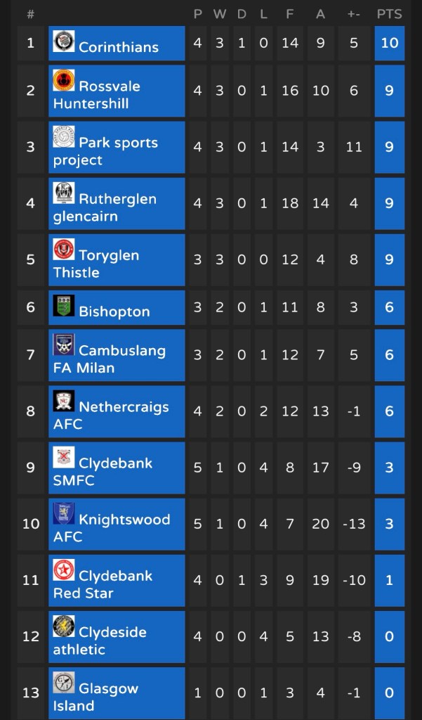 At the bottom end of the table Clydeside Athletic, Clydebank SMFC and Glasgow Islands are all in precarious positions.