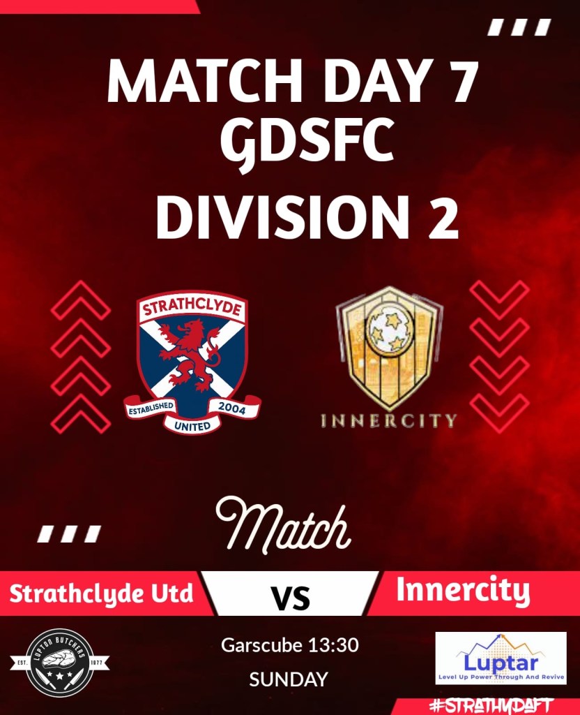 A fascinating encounter awaits on Match Day seven of the GDSFC Division Two as Strathclyde United FC (9th) host Innercity Football Club (14th) at Garscube.