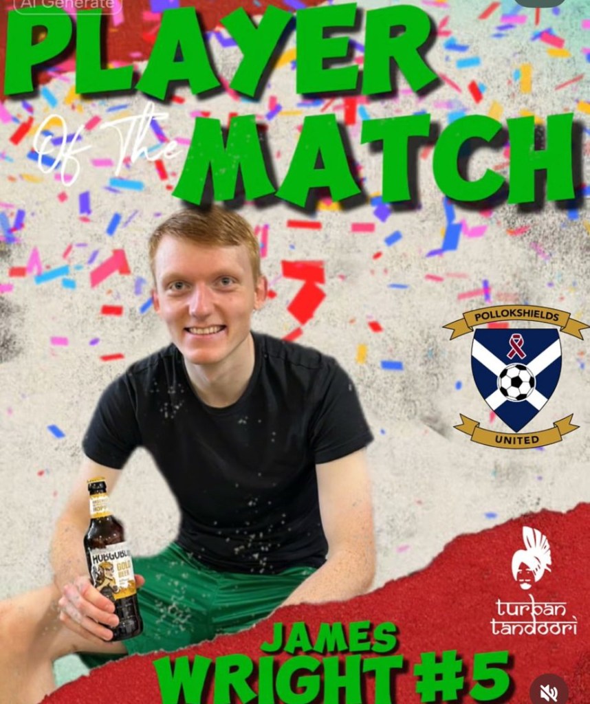 While the scoreline points to an offensive masterclass, the Pollokshields United defence was equally impressive, and it was centre-back James Wright (#5) who earned the Player of the Match accolade.