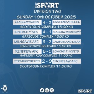 Division 2: Stonelaw hit nine at Scotstoun and Renfrew AFC hit six without reply at Harmony Row. Innercity AFC also stayed steady with a 4–1 home win.