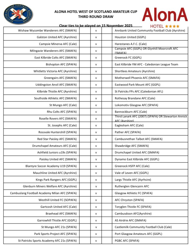The draw for the Alona Hotel West of Scotland Amateur Cup Third Round is out, and the Scottish Premier AFA (SPAFA) contingent has been handed a series of mouth-watering fixtures. With the ties set for November 15th, it’s a straight knockout to keep the dream of silverware alive.