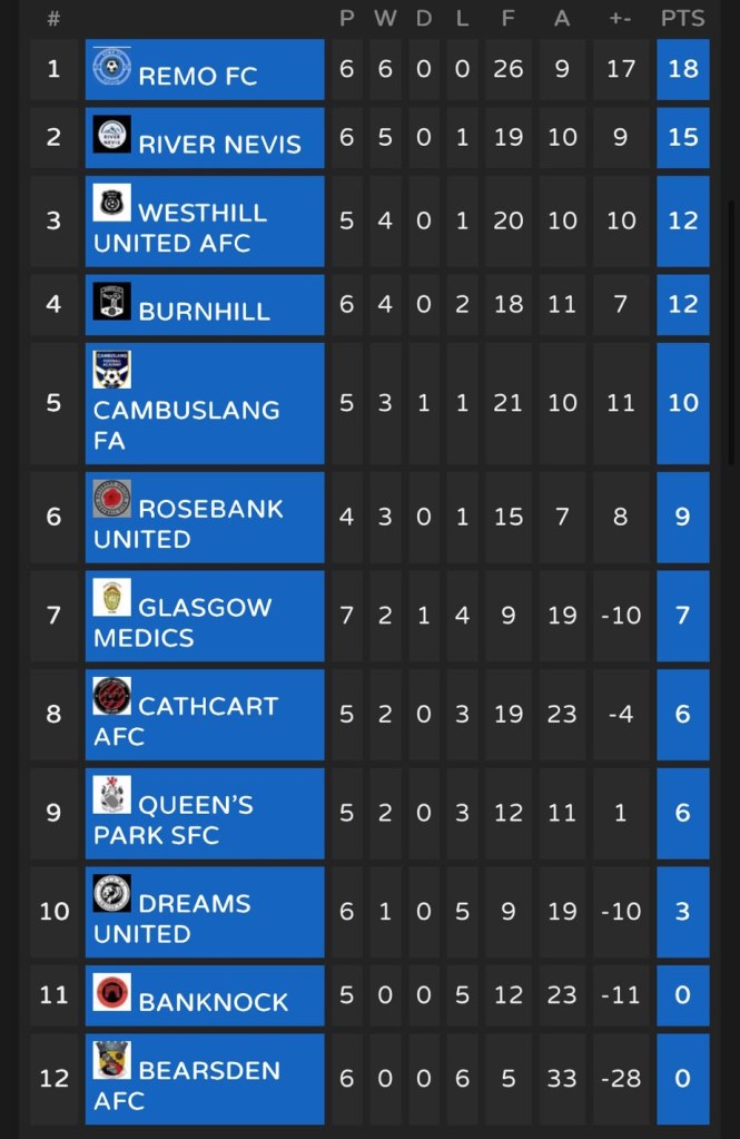 In a 12-team table, LS Memorial sit 10th with 3 points from six matches, having recorded one win. Banknock remain winless, occupying 11th place with 0 points from five fixtures played.