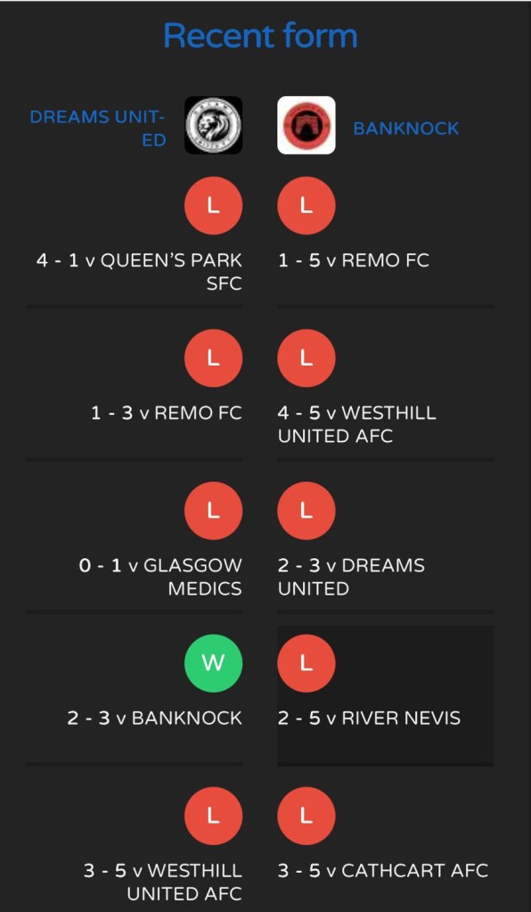 LS Memorial have endured a difficult run, falling to Queen’s Park SFC, Remo FC, and Glasgow Medics in their most recent outings. Banknock, meanwhile, have struggled just as much, with defeats to Remo FC, Westhill United AFC, and River Nevis.