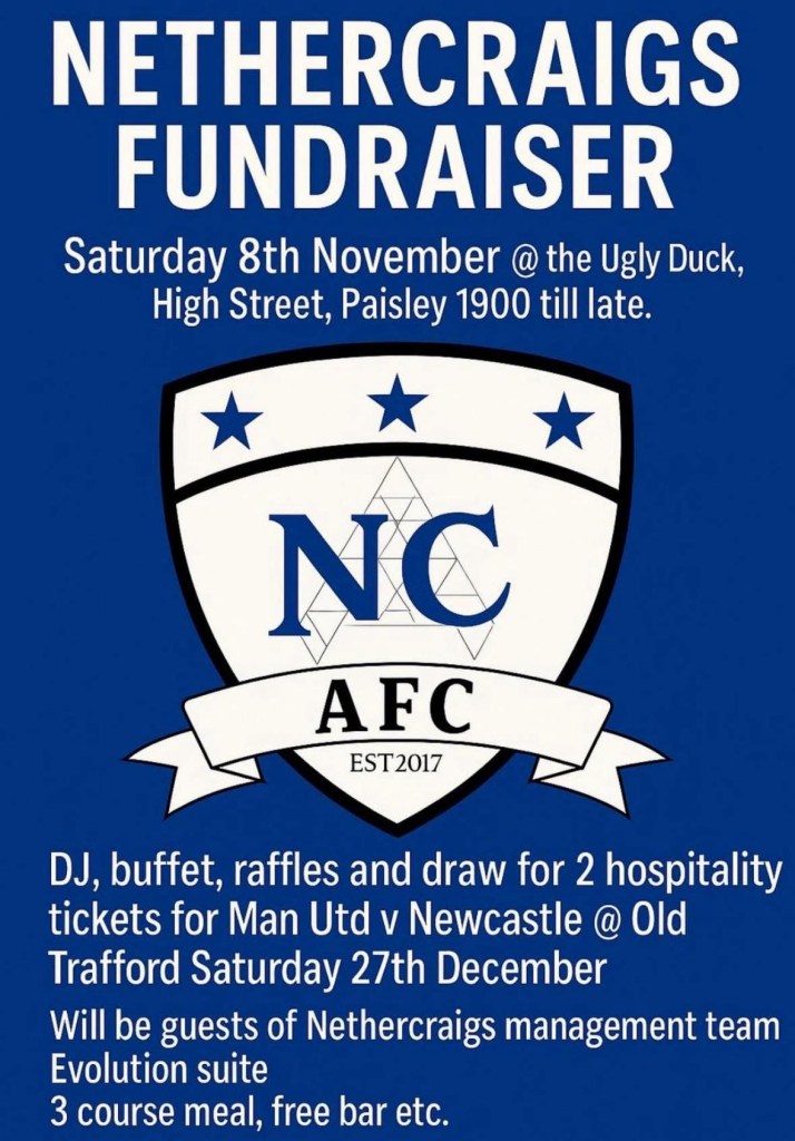 Nethercraigs Fundraiser this Saturday if anyone wants to come. Free entry and top prize if Evolution VIP Package for Man Utd v Newcastle 27/12/25