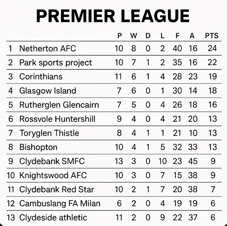 Nethercraigs stay in front, with PSP still in reach after their win. Results elsewhere keep the table tight at the top and through the middle, and Corinthians’ defeat means they surprisingly appear off the pace for now. The strength of the teams at the top means this season is shaping up to be one of the most competitive in recent years, with several sides still well placed in the title picture.