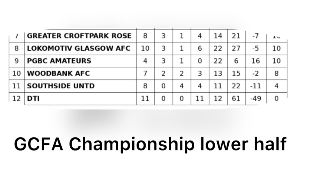 Greater Croftpark Rose, Lokomotiv Glasgow AFC, PGBC Amateurs, and Woodbank AFC remain close enough that small shifts could quickly change positions. Southside Untd and DTI are still searching for their first wins, with the second half of the season offering a reset point.