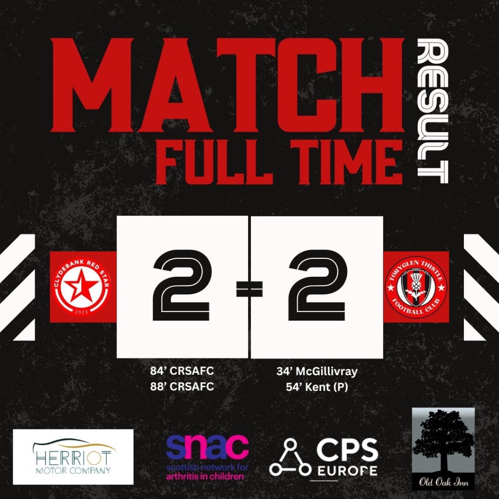 Toryglen will look back at this as a game as they had it in their own hands. But a resilient Clydebank Red Star earned their valuable point. They stayed in the game, they stayed organised, and they took their chance when it finally came..