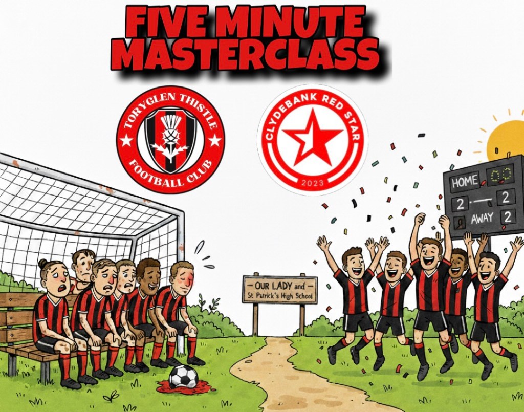 Five minutes changed everything. What looked like a routine away win for Toryglen Thistle ended with Clydebank Red Star refusing to go away