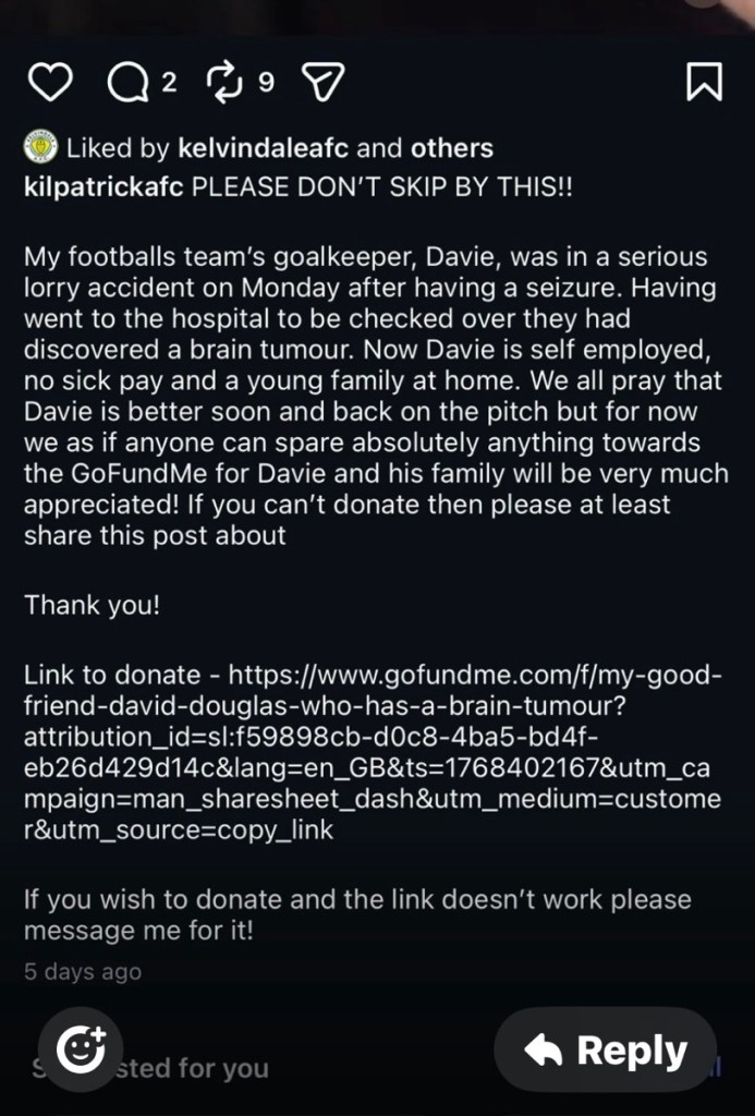 His club has shared this update publicly to ask for support. He is self-employed, has no access to sick pay, and has a young family at home. A GoFundMe has been set up to help ease the immediate pressure on his family while he focuses on treatment and recovery.
