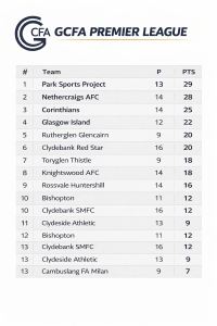 Park Sports Project move top of the Premier League on 29 points from 13 games. Nethercraigs AFC sit one point back on 28 from 14, having played a game more. Games played in the division range from 9 to 16, leaving the top end compressed but uneven.
