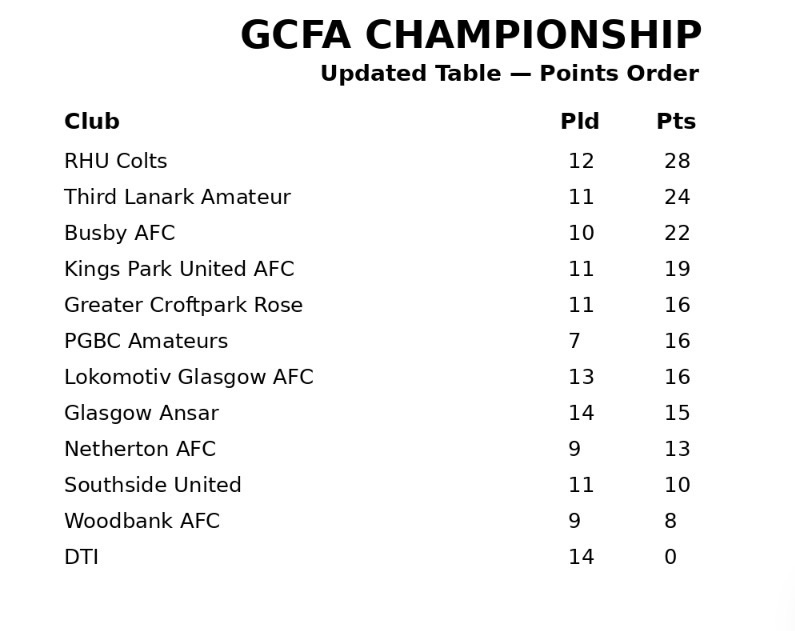Corinthians currently hold third place on 25 points from 14 matches. Glasgow Island sit fourth on 22 points from 12 — two games fewer and a higher points-per-game return than their hosts.