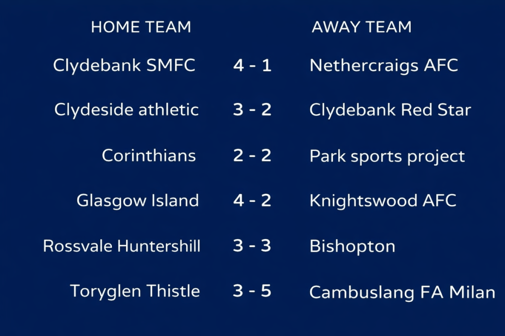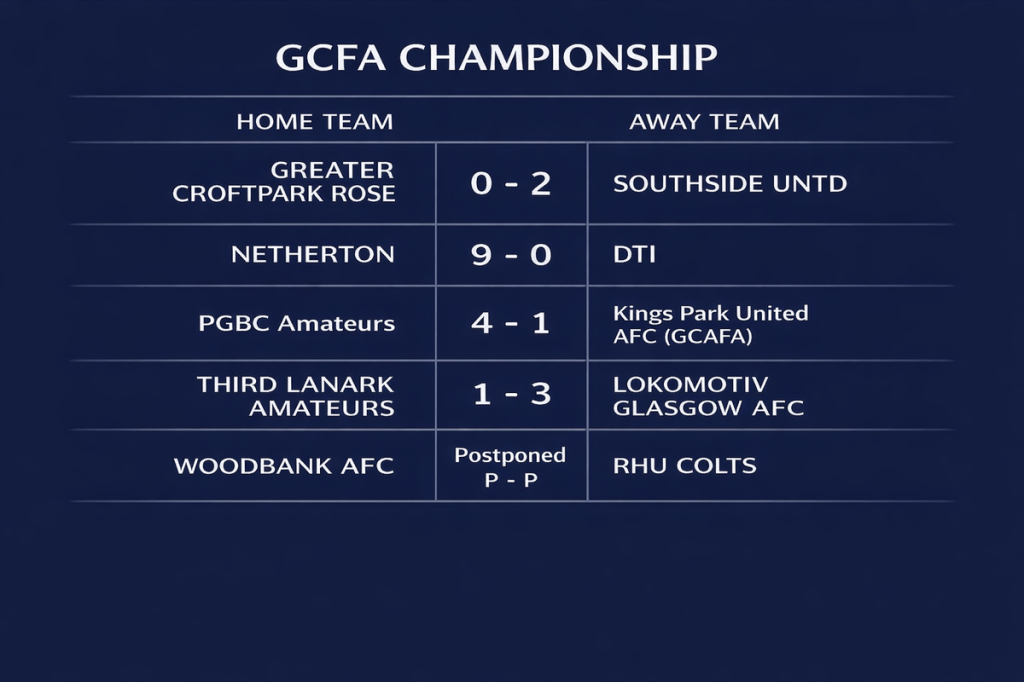 In the Championship, Netherton AFC recorded a 9–0 win over DTI AFC, while Lokomotiv Glasgow won 3–1 away at Third Lanark Amateurs.