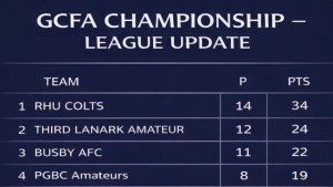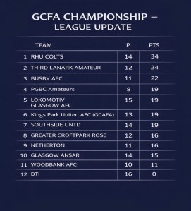 RHU Colts remain ten points clear at the top, while four clubs now sit level on 19 points in a tightly compressed middle section. Games in hand continue to shape the picture as positioning shifts across the Championship.