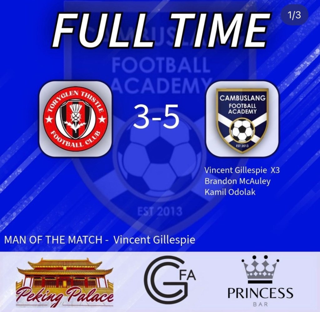 In league action, Gary Arbuckle’s hat-trick helped Clydebank SMFC to a 4–1 win over Nethercraigs at Holm Park, while Jamie Curran’s treble secured three points against Kings Park United at Parklea.