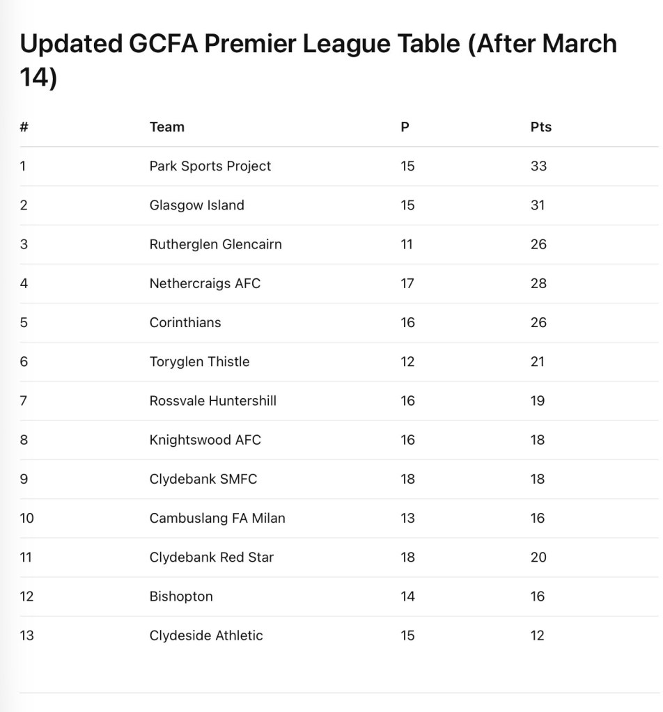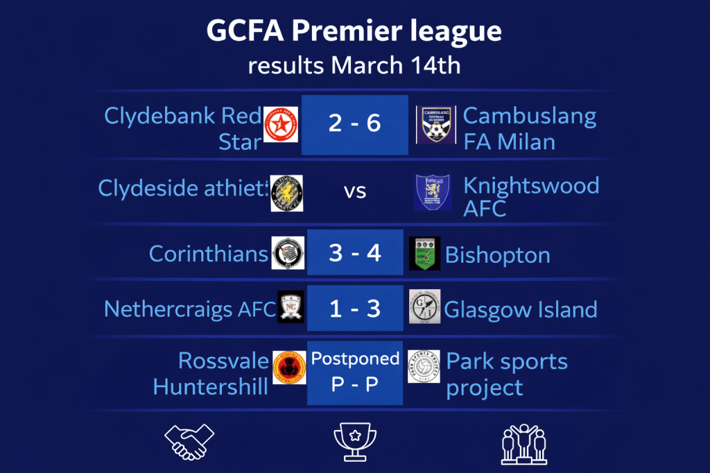 At the top end of the table, Glasgow Island’s 3–1 win away to Nethercraigs AFC ensures the pressure remains firmly on the leaders heading into the next set of fixtures.