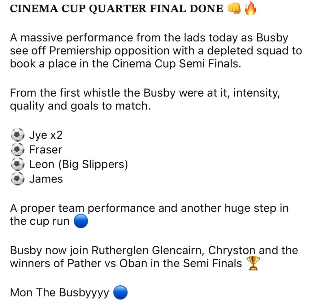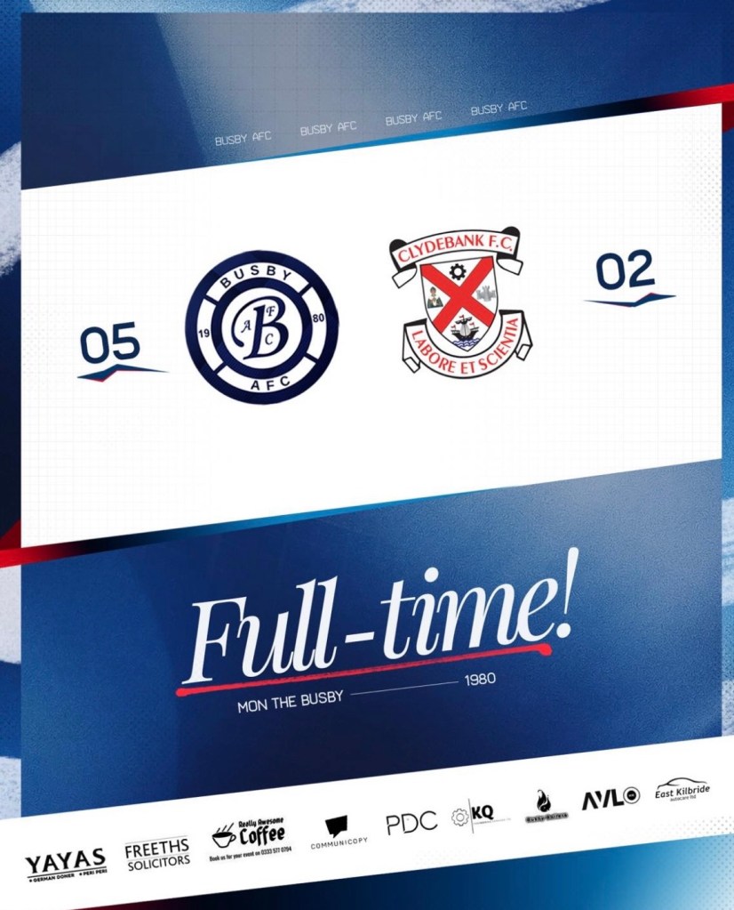 Busby came up against higher-league opposition but handled it well on the day. They were organised, took their chances, and stayed in control of the game.