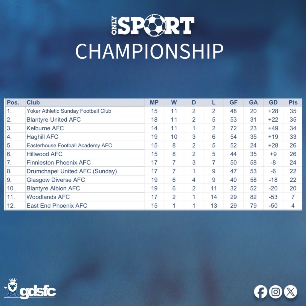 Yoker and Blantyre United both sit on 35 points. Kelburne are one behind on 34 — and have played fewer games than both.