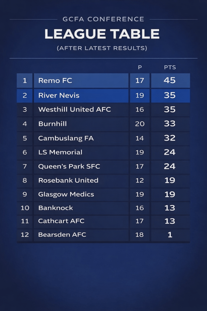 Westhill United secured a professional 3-1 win against Rosebank United at Scotstoun. This result, combined with Burnhill’s defeat, allows Westhill United to move into 3rd place, tied on points with River Nevis but boasting a far superior goal difference (+43).