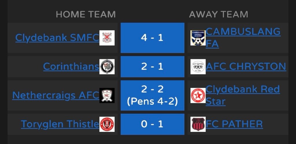 While other games were tight, Clydebank SMFC made a statement with a clinical 4–1 win over Cambuslang FA. The home side looked in control from the early stages, ensuring there would be no “cupset” at Holm Park. Their clinical finishing makes them arguably the team to beat heading into the semi-finals.