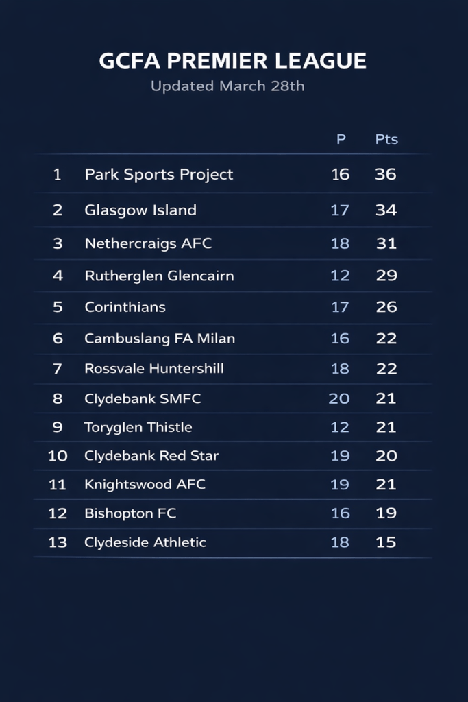 • Clydeside Athletic 2–7 Rutherglen Glencairn — moves Rutherglen onto 29 points from 12 games