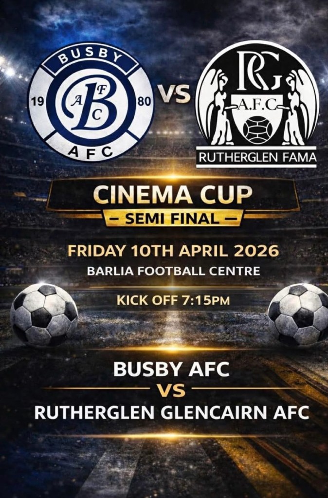 Barlia Football Centre hosts a big Cinema Cup semi-final this Friday, April 10th, as Busby AFC take on Rutherglen Glencairn AFC. Kick-off is 7:15pm, with a place in the final on the line and a real chance at silverware for both sides.