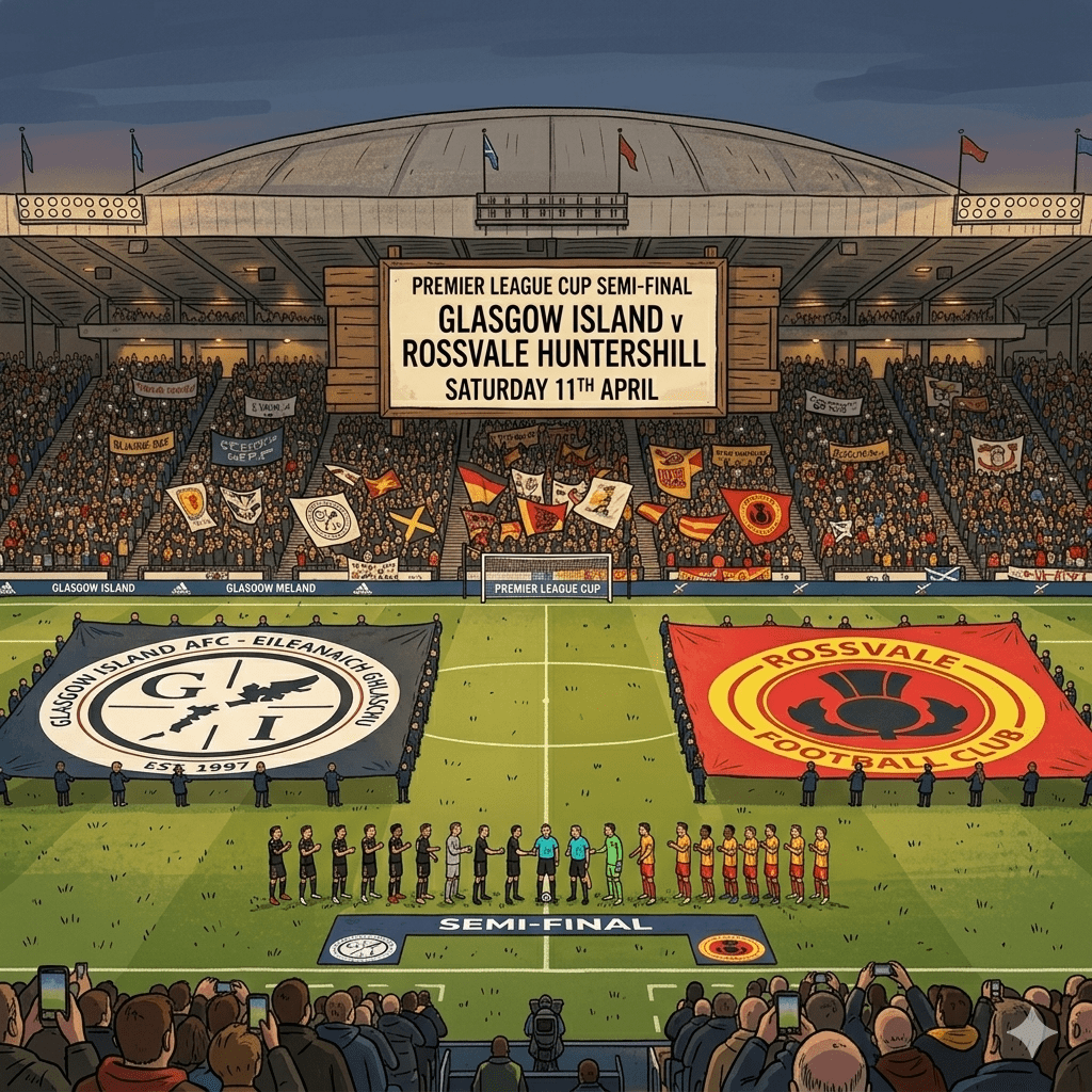 The Premier League Cup reaches its semi-final stage this Saturday morning with an intriguing clash between Rossvale Huntershill and Glasgow Island, set for a 9am kick-off at Greenfield Astro.