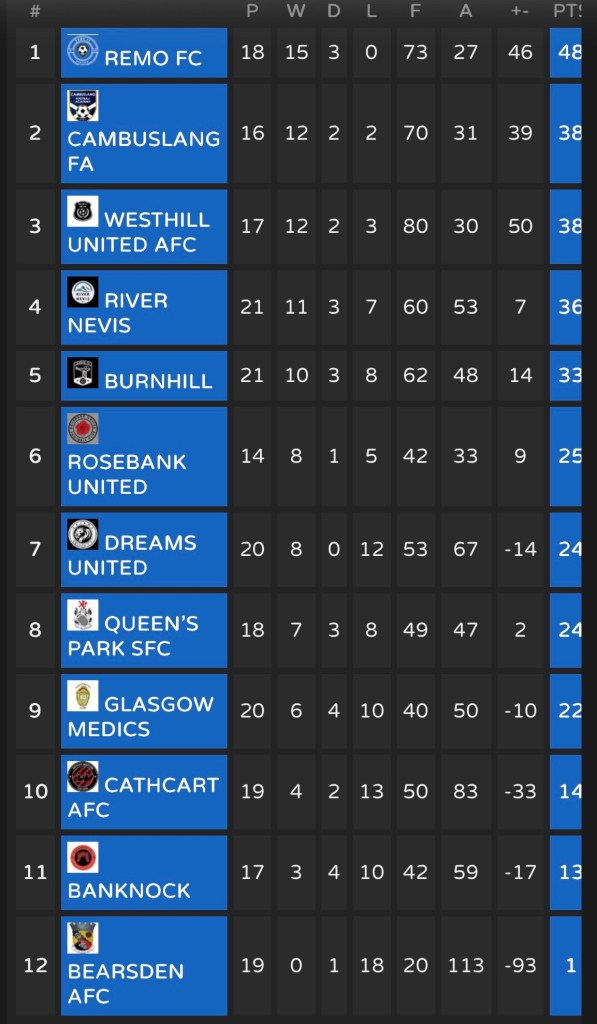 As we look at the table, Remo FC appears to be cruising toward the title, but the battle for the silver medal is heating up between Cambuslang and Westhill. At the other end of the spectrum, Bearsden AFC is in desperate need of a miracle to turn their season around. With games in hand for several teams, the mid-table shuffle is far from over.