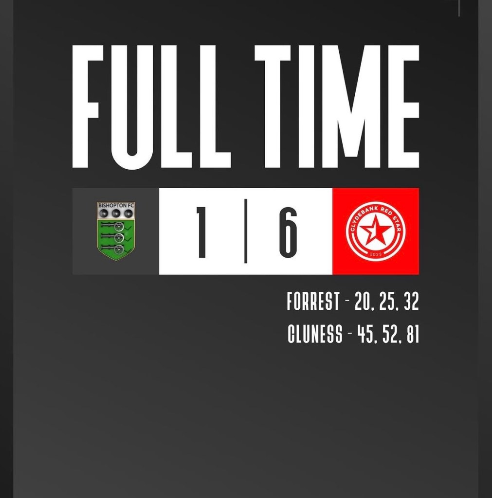 In a blistering spell that will be talked about for a long time, Forrest tore through Bishopton with a stunning 10-minute hat trick, flipping the game on its head and setting the tone for what would become a dominant afternoon for Red Star.