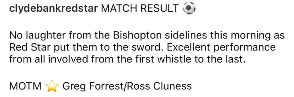 Bishopton will be hurting, and you can bet they’ll be circling the next fixture. Red Star, meanwhile, have laid down a marker: they’re not going quietly.