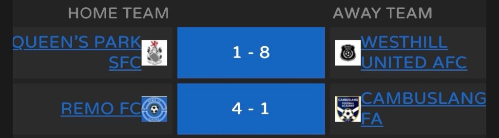 The most lopsided result of the day came at Queen’s Park, where Westhill United put on a masterclass in attacking football. An 8-1 away victory is rare at any level, and it keeps the pressure firmly on Remo FC.