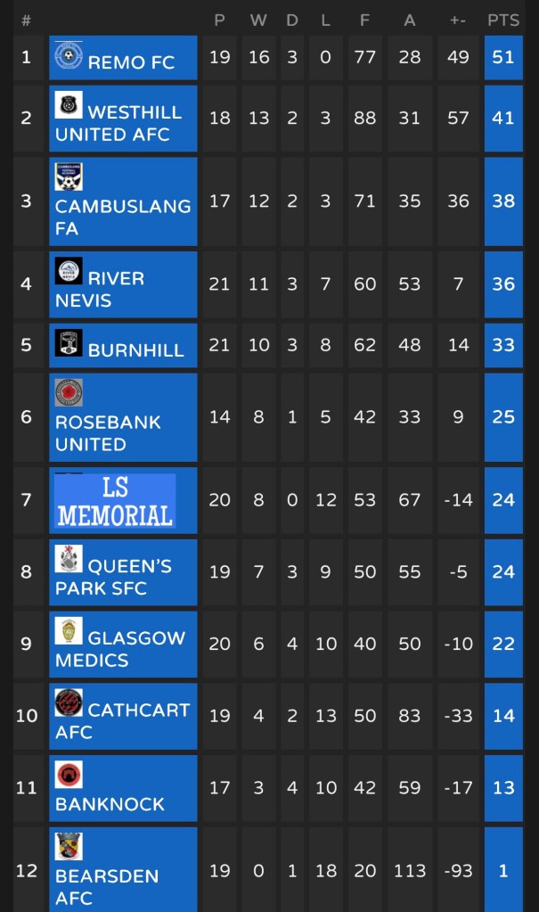 • The Impact: Remo FC extends their lead at the summit to 51 points, maintaining their incredible undefeated record (16-3-0). For Cambuslang, the loss stalls their momentum, leaving them 13 points adrift of the top, though they still hold games in hand.