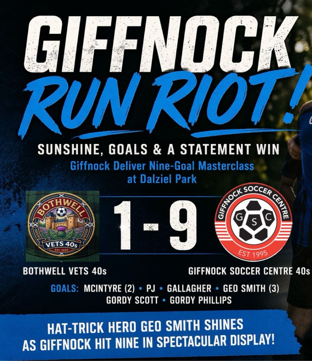 Under clear skies at Dalziel Park, Giffnock Soccer Centre 40s delivered a ruthless and exhilarating performance to dismantle Bothwell Vets 40s in a nine-goal masterclass.