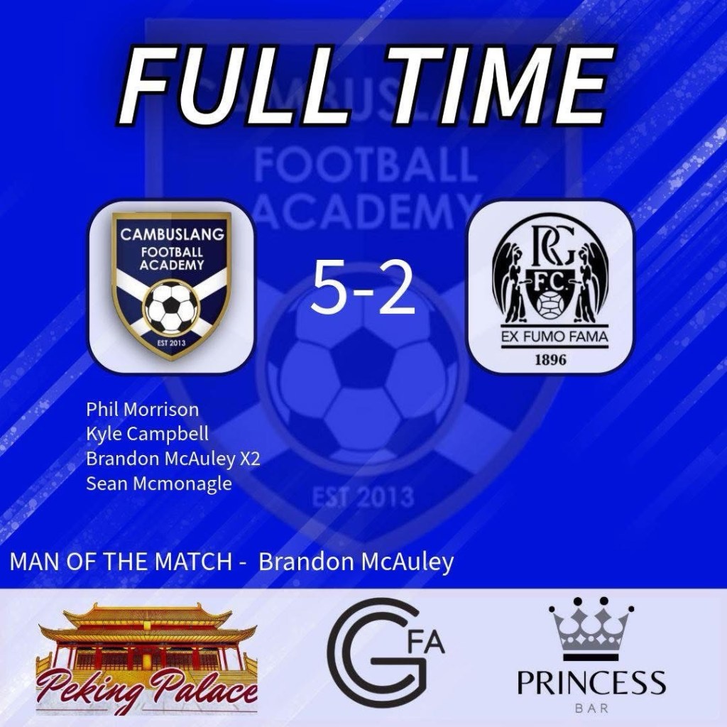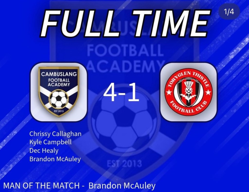 Cambuslang Milan ran out 4â1 winners, showing control and a clinical edge in the final third. Brandon McAuley was the standout, leading the line well and making the difference at key moments.